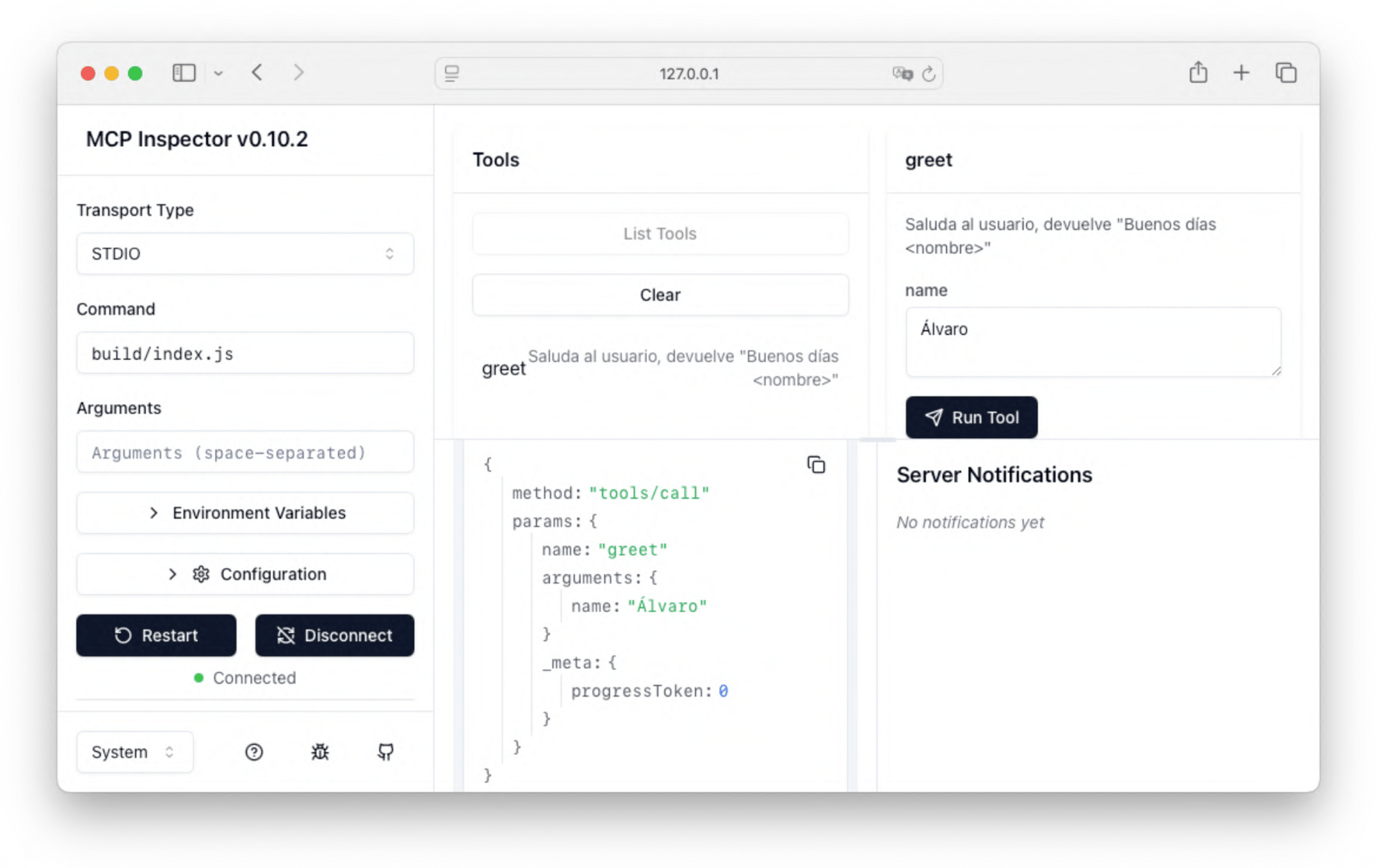 npx @modelcontextprotocol/inspector node dist/index.jsEsto te abrirá un panel en el navegador donde verás tu herramienta download, podrás pegarle una URL de YouTube manual y ver cómo responde tu servidor en tiempo real.